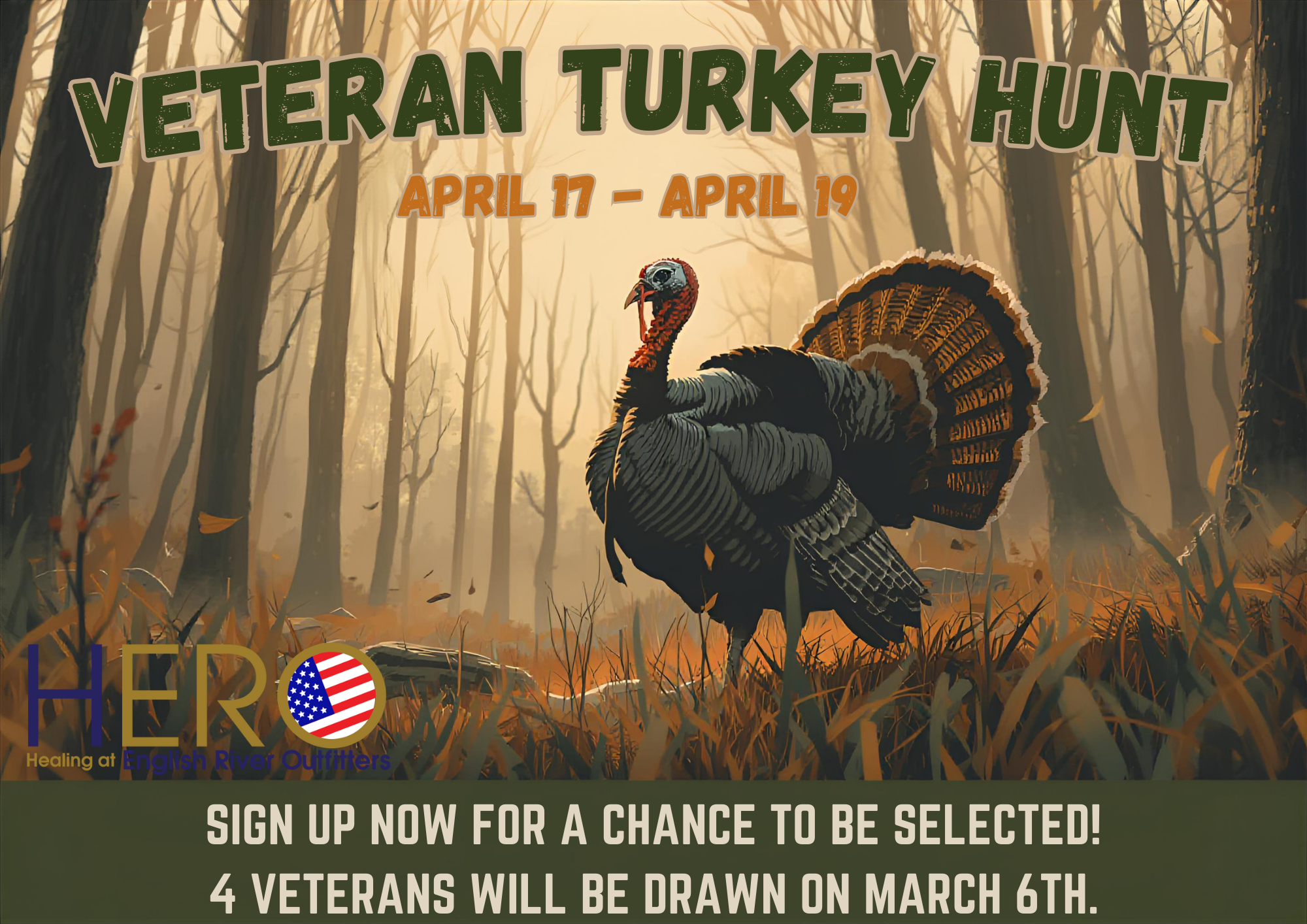We’re proud to invite Veterans to an unforgettable outdoor experience — a Turkey Hunt at the peaceful and scenic Healing English River Outfitters Lodge! 👉 Interested? Click on the event and fill out the registration form.